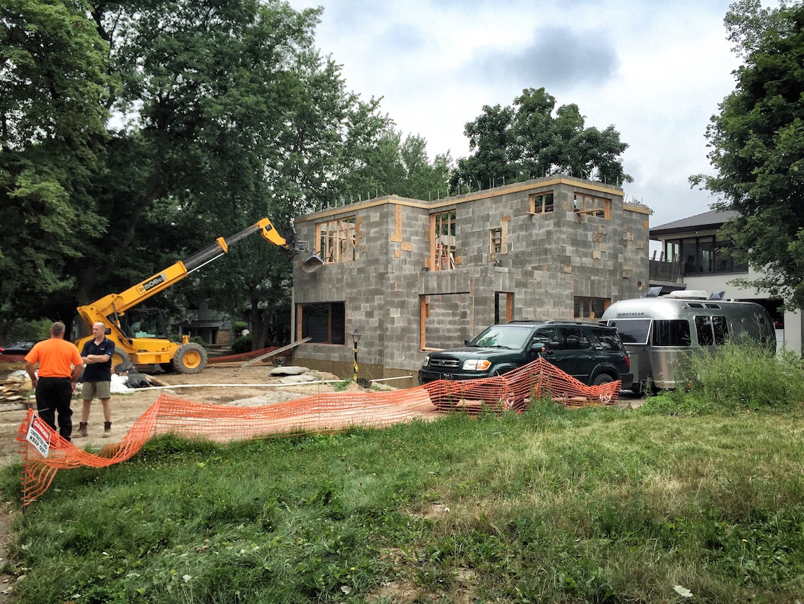 And upon our return, it looked like this: floor poured, windows in, roof on, front curve…uh, still a work in progress. This also serves as the kids’ First Day of School picture. Yes, we travelled until the last minute.