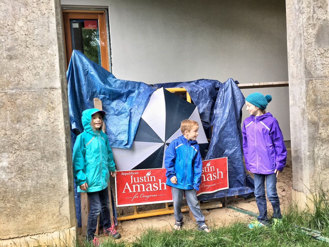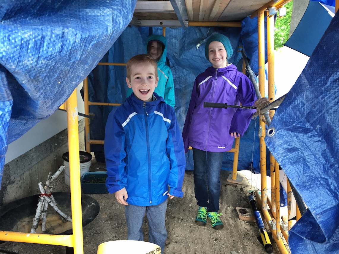Eventually the rain stopped and Aunt Amber was on her way. The kids busied themselves making a correct politically incorrect fort out of construction debris.